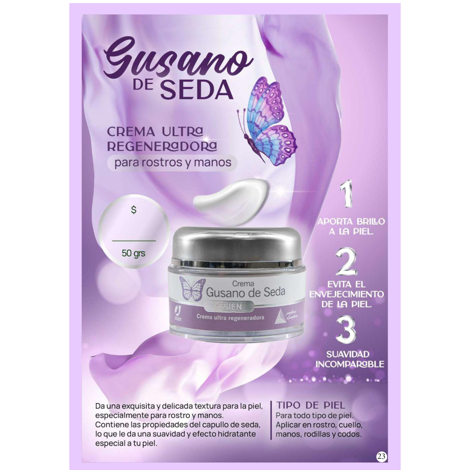 Crema ultra regeneradora. Da una exquisita y delicada textura para la piel, especialmente para el rostro y manos. Contiene las propiedades del capullo de seda, lo que le da una suavidad y efecto hidratante especial a tu piel. Otorga una apariencia más juvenil y libre de acné.
